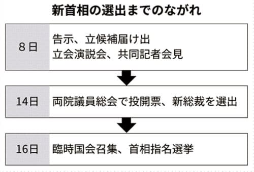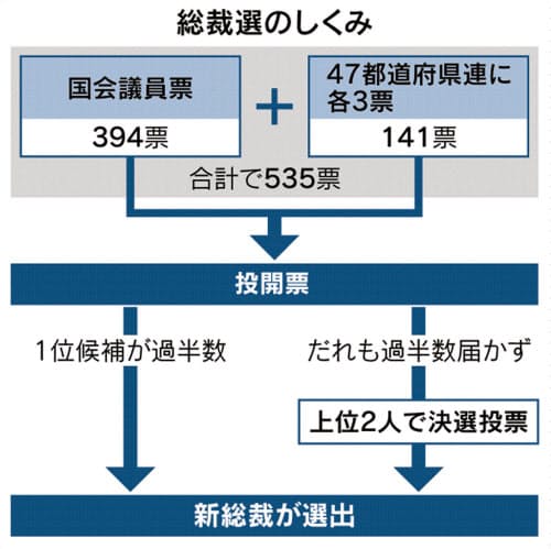 総裁選は14日に投開票される。全国一斉の党員・党友投票は見送り党大会に代わる両院議員総会で決める。党所属の国会議員票394、都道府県連に3票ずつ割り振った地方票141の計535票で争う。