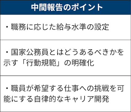職務内容で報酬を定める制度は現在、任期付きの民間人材の登用などに限って採用できる。今回の中間報告は無期雇用を含めて様々な分野に順次広げる方向性を打ち出した。まずは人材獲得の必要性が高い分野などで導入することが念頭にある。