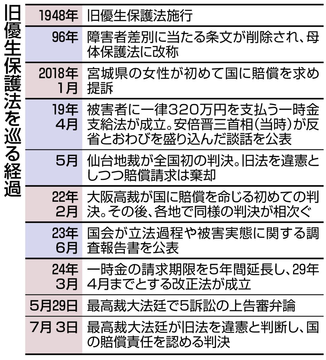 2019年4月、被害者への一時金支給法が議員立法でようやく成立したが、「損害賠償責任を前提とせず、一時金320万円にとどまる」と指摘。自治体による当事者への個別通知も行き届いておらず、制度を知らない人も多いとみられ、約2万5000人とされる被害者のうち支給認定を受けたのは約4%(今年5月末時点)にとどまる。法制定時に当時の安倍晋三首相が「反省とおわび」の談話を発表したが、旧法の違憲性に触れず、訴訟でも国側は曖昧な態度を続けた。
